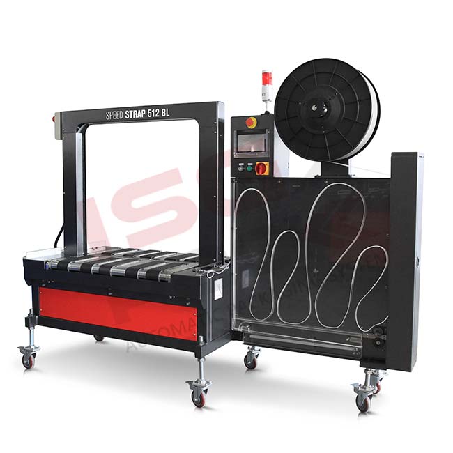 Seria Speed Strap BL to w pełni automatyczna wiązarka niskostołowa, którą można umieścić na w pełni zautomatyzowanych liniach pakujących, gdzie wymagana jest niska wysokość stołu roboczego. Jest wyposażona w zmotoryzowany przenośnik taśmowy i fotokomórki do pojedynczego, podwójnego lub wielokrotnego automatycznego wiązania. Współpracuje z bezszczotkowymi silnikami 24 Vcc rozmieszczonymi dla każdej funkcji mechanicznej. Nadaje się do wysokiej wydajności produkcyjnej i jest wysoce niezawodny. Ekran dotykowy o przekątnej 7,2 cala umożliwia dostosowanie każdej funkcji roboczej, oszczędzając czas produkcji. Ta wiązarka jest również dostępna z górną prasą i ze stali nierdzewnej SUS 304.