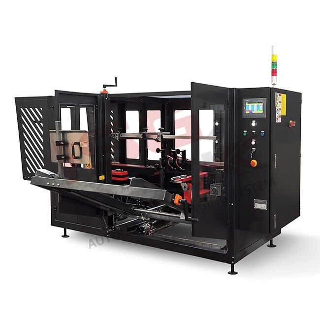 Półautomatyczna maszyna do formowania pudełek typu klapowego z funkcją składania czterech dolnych klap i podtrzymywania ich podczas operacji napełniania przez operatora. Pudełko jest wkładane pod kątem przez naciśnięcie