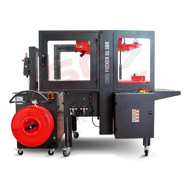 Combo automatycznie dopasowująca się zaklejarka do rozmiaru wprowadzanego kartonu bez udziału operatora połączona z automatyczną wiązarką do taśmy PP pozwalającą na integrację w linie pakującą gdzie po umieszczeniu produktów w pudle kartonowym urządzenie zaklei górne i dolne klapy kartonu po czym automatycznie wprowadzi do wiązarki która wykona 1 lub dwa spięcia w zależności od długości kartonu i zaprogramowanego trybu pracy.