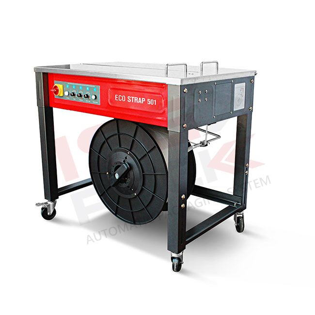 Półautomatyczna wiązarka nowej generacji, model ECO STRAP 501, wyposażony jest w silniki prądu stałego, które sterują każdą funkcją urządzenia oraz posiada elektroniczny naciąg taśmy regulowany potencjometrem umieszczonym na panelu sterowania. Dzięki obrotowym kółkom może być łatwo przemieszczana i lokalizowana w zależności od potrzeb magazynu. Bardzo konkurencyjna cenowo i kompaktowa maszyna do spinania taśmą, niezwykle wydajna przy każdej średnio-niskiej wydajności pracy. Nadaje się do spinania pudełek, paczek, wiązek. Może być stosowana w magazynach, biurach, supermarketach, sklepach, logistyce, wszędzie tam gdzie wymagane jest bezpieczne pakowanie.