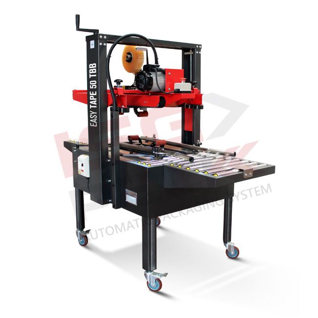 Półautomatyczna zaklejarka do kartonów EASY TAPE 50 TBB jest urządzeniem wyposażonym w podajnik rolkowy na wejściu do urządzenia oraz drugim na wyjściu. Zaklejarka została przystosowana do zamykania 3 klap kartonu. Maksymalna waga kartonu to 40kg. Jednoczesne zaklejanie góry oraz spodu kartonu poprzez dwie głowice zaklejające standardowo obsługujące taśmy o szerokości 50mm-75mm. Urządzenie dostosowane do zaklejania wysokich niestabilnych kartonów.