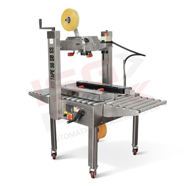 Półautomatyczna zaklejarka do kartonów klasy „Entry-Level” jest podstawowym modelem urządzeń do zaklejania. Maszyna do zaklejania kartonów taśmą Eco Tape 50 SB może obsługiwać pudła do maksymalnej szerokości oraz wysokości 500mm. Minimalna wysokość kartonu 100mm.