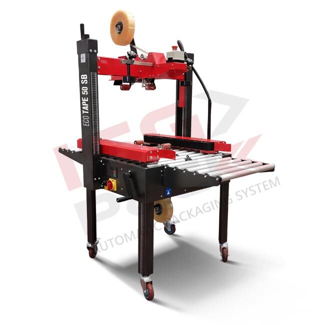 Półautomatyczna zaklejarka do kartonów klasy „Entry-Level” jest podstawowym modelem urządzeń do zaklejania. Maszyna do zaklejania kartonów taśmą Eco Tape 50 SB może obsługiwać pudła do maksymalnej szerokości oraz wysokości 500mm. Minimalna wysokość kartonu 100mm.